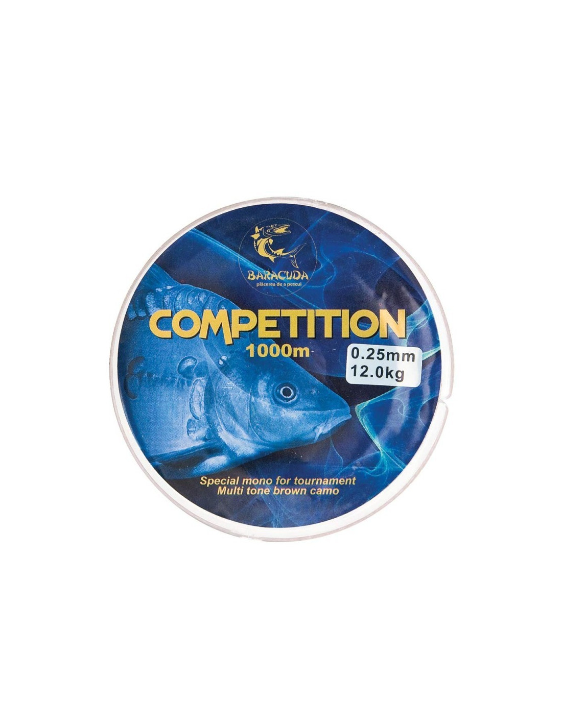 Fir-ul monofilament Baracuda Competition 1000 m este un monofilament japonez specializat pentru pescuitul la crap/somn, recomandat pentru competitii. Culoarea este “brown camo”, adica o multitudine de tonalitati de maro, ultimul trend în domeniu. Este invizibil în apa, fara memorie și foarte rezistent la uzura.